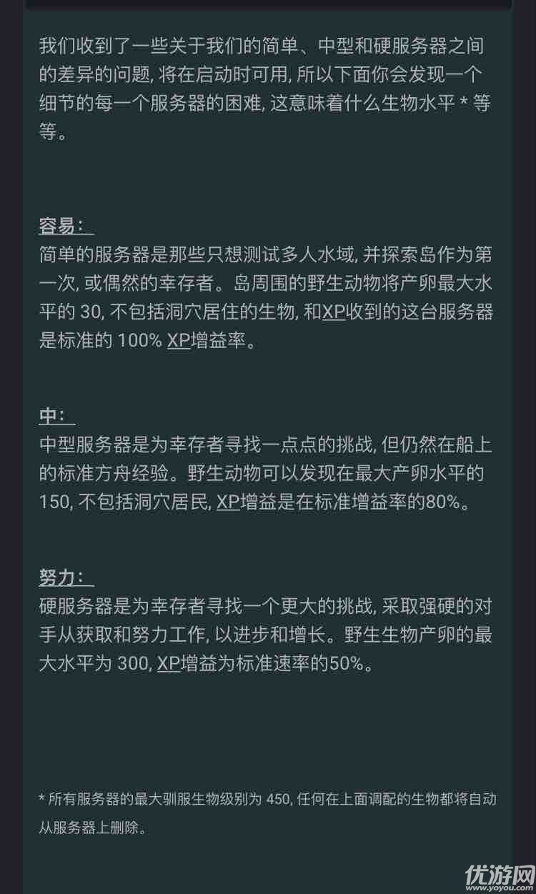 方舟生存进化手机版难度应该怎么选,在方舟生存进化手机版游戏界面中一共有三种不同的难度玩法,不少小伙伴胡乱选择进去就成盒,那么怎么样选择合适自己难度的服务器呢,接下来就让小编带着大家一起来看看方舟生存进化手机版难度选择攻略,希望对大家有帮助。方舟生存进化手机版难度选择攻略自己根据自己对游戏的了解选择适