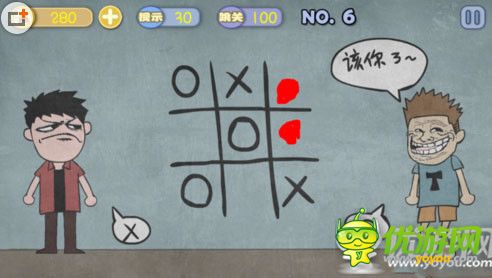 史上最贱暴走游戏第6关怎么通关;史上最贱暴走游戏第6关通关详细讲解;史上最贱暴走游戏第6关攻略;2个手指同时点在可以练成3个叉叉的空白处就OK了!