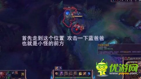 LOL怎么无伤打野;LOL惊天BUG教你1级无伤打野怪详解;感兴趣的玩家一起来看看吧;1、首先要走到图示中的红点位置,攻击一下蓝爸爸,注意要站在小怪的前方位置攻击2、然后就是向下后方移动拉扯蓝爸爸走过来,不过尤为重要的是千万别把小怪拉动位置了,我们还指望他俩卡着蓝爸爸呢3、再就是拉扯蓝爸爸到小怪与墙