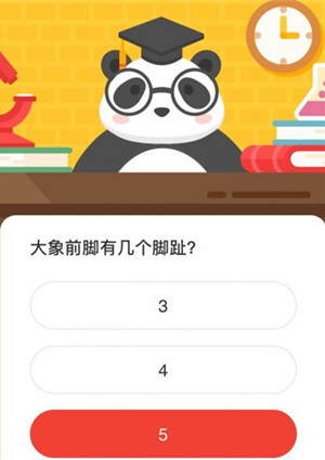 森林驿站5月6日森林小课堂每日一题的问题是:大象前脚有几个脚趾?题目给出的选项是3、4、5,大家知道正确答案是哪一个吗?下面就是小编为大家整理的正确答案了,有需要的小伙伴们拿走不谢,答题后不要忘了领取能量哦!森林驿站5月6日每日一题答案问题:大象前脚有几个脚趾?345答案:5答案解析非洲草原象前脚4