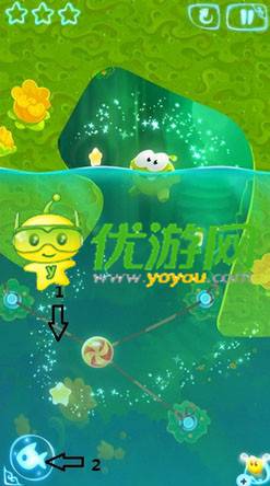 割绳子魔法第四章4-4关怎么通关;割绳子魔法第四章4-4关怎么过;割绳子魔法第四章4-4关通关攻略;先割断箭头1的绳子接着改变主角的形态。接着割断糖果的绳子,最后恢复主角的形态即可。