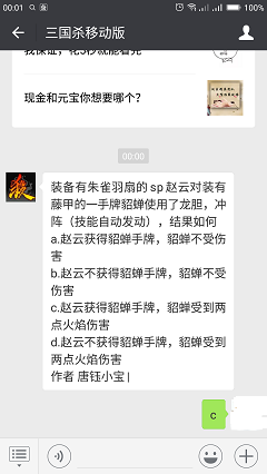 装备有朱雀羽扇的sp赵云对装有藤甲的一手牌貂蝉使用了龙胆,冲阵(技能自动发动),结果如何?这是三国杀微信公众号2018年6月3日每日一题问题,今天的答案考验玩家对三国杀各英雄技能的熟练程度,小编这就为大家分享下装备有朱雀羽扇的sp赵云对装有藤甲的一手牌貂蝉使用了龙胆,冲阵(技能自动发动),结果如何答