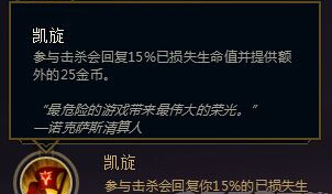 lol凯旋符文天赋怎么样?lol精密系分支凯旋介绍、是不是还有好多小伙伴不知道呢?那些还知道的快来和小编一起看看吧凯旋参与击杀会回复你15%的已损失生命值并提供额外的25金币别看就一句话的介绍这个天赋基本上是人手必点的效果不要太给力杀人或者助攻的同时回一口血,还tm给钱