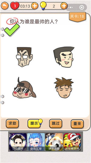 我不是猪头第18关答案是什么?我不是猪头第18题的题目是:你认为谁是最帅的人?题目给出的4个选项都不是正确答案,那么这道题要怎么做呢?下面就是我不是猪头第18题攻略了,小伙伴们都来看看吧!我不是猪头第18关答案问题:你认为谁是最帅的人?答案:你》》》我不是猪头攻略答案大全《《《(点击进入)PS:点击
