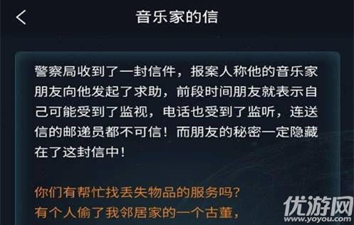 犯罪大师音乐家的信答案是什么?犯罪大师最新更新的离奇案件《音乐家的信》要求我们找出音乐家想要在信中表达的真正含义,那么音乐家究竟想对警察说什么呢?下面就是音乐家的信犯罪大师答案解析了,一起来看看吧!犯罪大师音乐家的信答案是什么参考答案:有人要报复我《音乐家的信》警察局收到了一封信件,报案人称他的音乐