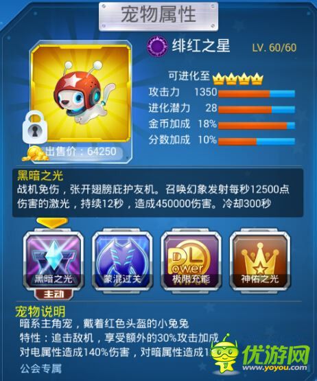 近日全民飞机大战中新出了一批皇冠宠,绯红之星也是其中一个。那么全民飞机大战绯红之星好不好?全民飞机大战绯红之星怎么获取?全民飞机大战绯红之星技能属性?接下来小编为大家带来全民飞机大战绯红之星详解:绯红之星满级属性【黑暗之光】:战机免伤,张开翅膀庇护友机。召唤幻想发射每秒12500点伤害的极光,持续1