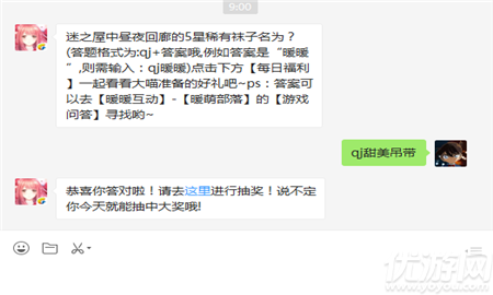 迷之屋中昼夜回廊的5星稀有袜子名为?这是今天奇迹暖暖的微信公众微信号的每日一题,很多玩家对于套装的了解程度并不高,很多时候的每日一题刚好考验这个。下面小编就来给大家公布下正确答案。奇迹暖暖2018年12月23每日一题问题迷之屋中昼夜回廊的5星稀有袜子名为?(答案各式为qj+答案哦,例如答案是“暖暖”