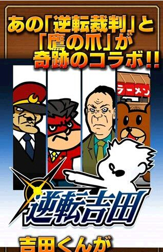 《逆转吉田》是游戏厂商Capcom结合了《逆转裁判》和《秘密结社鹰之爪》的世界观和角色等要素开发的一款法庭战斗育成模拟游戏!目前这款游戏已经上架双平台,喜欢的玩家可以下载试玩!游戏玩法非常简单,玩家需要在游戏中收集情报,或者进行特殊搜查来收集证据来取得法庭上的胜利!更多新游资讯,请关注!