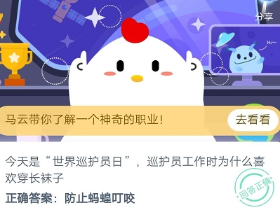 今天是世界巡护员日,巡护员工作时为什么喜欢穿长袜子?防止蚂蝗叮咬、时尚修身又保暖。这是蚂蚁庄园小课堂7月31日的题目,小伙伴们知道巡护员在工作室为什么都要穿长袜吗?知道答案的用户直接点击正确选项即可领取饲料奖励哦!蚂蚁庄园7月31日每日一题答案问题:今天是世界巡护员日,巡护员工作时为什么喜欢穿长袜子