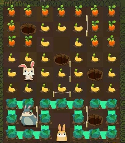 patchmania兔子复仇记营救第44关攻略;patchmania兔子复仇记营救第44关怎么过;第一步:胖兔子吃掉绿色的卷心菜第二步:小小兔吃掉黄色马铃薯第三步:小兔子吃完剩下的胡萝卜收工