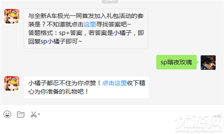 与全新A车极光一同首发加入礼包活动的套装是?答题格式:sp+答案,若答案