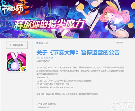 节奏大师停服后还能玩吗?今天下午3点深受玩家喜爱的《节奏大师》突然宣布暂停运营,并且该游戏还会在近期下架。那么,节奏大师下架后玩家可以登录游戏吗?有兴趣的小伙伴们都来看看吧!节奏大师停服后还能玩吗节奏大师停服后玩家就无法登陆游戏了。《节奏大师》暂停运营公告亲爱的各位玩家:《节奏大师》自2012年7月