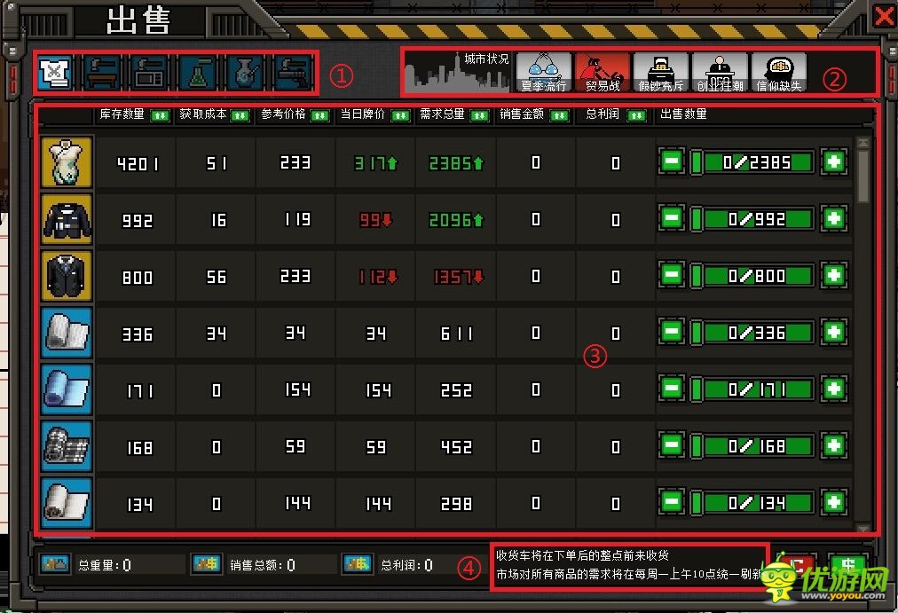 今天小编为大家带来上帝之城:监狱帝国销售交易买卖系统详解:销售页面(v)1:6类可交易物资,不在这6类的可以去当铺或者卖给黑市商人。2:城市状态,也可当做市场行情,现在不能人为操纵。颜色越重表示造成影响越大,白色可能只有小种类或者小规模,红色则是大规模市场变化,一般消退时间在一周之内,但是可能存在连