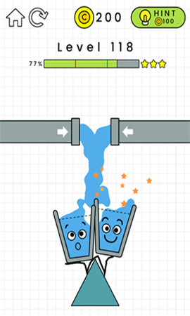 happyglass118关怎么过?这关看上去很简单,实际也很简单,但是最关键的是2个水杯下面是一个三角形,没有支撑点,很容易让水杯掉落下来。下面小编就来讲下过关技巧。happyglass118关攻略这关是2个水杯和2根水管,本来只要顺利放水就可以正常流入到水杯中即可过关。但是2个水杯下面确是2个三