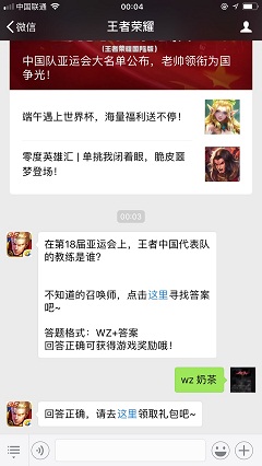 在第18届亚运会上,王者中国代表队的教练是谁?这是王者荣耀微信公众号上2018年6月13每日一题问题,今天的答案是不是还有好多小伙伴不知道的。别着急,小编这就为大家分享下在第18届亚运会上,王者中国代表队的教练是谁答案,希望对大家有帮助。2018王者荣耀6月13每日一题问题在第18届亚运会上,王者中