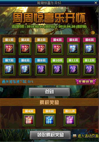 DNF2月1日签到活动,相信有不少玩家都比较关心,今天小编就给大家分享一下,DNF周周惊喜乐开怀签到活动的相信内容,有需要的小伙伴,和小编一起来看看吧,希望对大家有所帮助。周周惊喜乐开怀签到活动:每周通关推荐地下城4次,即可完成签到,另外第4次、8次、11次还会有特殊奖励每周签到奖励第4次、8次、1