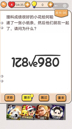 我不是猪头第95题答案是什么?一定还有很多玩家无法理解我不是猪头第95关中小花递给阿聪的纸条吧,下面就让小编为大家介绍一下这张纸条内容的含义,还没有通关的小伙伴们都来看看吧!我不是猪头第95题答案问题:理科成绩很好的小花给阿聪递了一张纸条,然后他们就在一起,请问为什么?答案:将纸条上公示的上半部分擦
