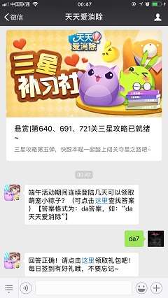 端午活动期间连续登陆几天可以领取萌宠小粽子,这是天天爱消除微信公众号2018年6月14每日一题问题,今天的天天爱消除每日一题答案在游戏公告就可以知道的,小编这就为大家分享下端午活动期间连续登陆几天可以领取萌宠小粽子的答案,希望对大家有帮助。2018天天爱消除6月14日一题问题端午活动期间连续登陆几天