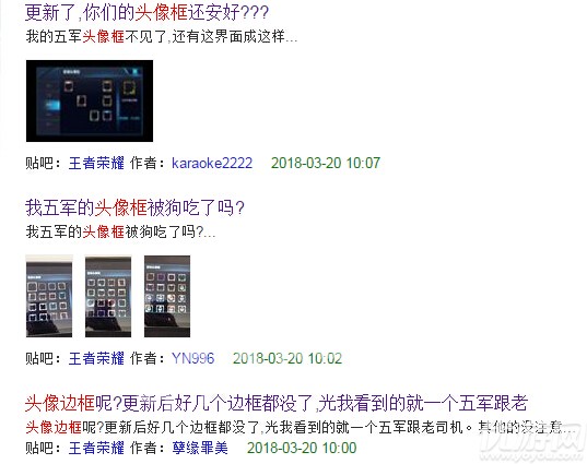 王者荣耀在今天进行了一次大更新,但是有很多小伙伴在更新之后都遇到了这样的一个情况,就是自己的头像框不见了,这是怎么回事呢?王者荣耀更新后五军对决头像框怎么没了3.20更新后头像框消失了怎么回事 贴吧有很多小伙伴都在问:头像框选择界面不少头像框都离奇消失:这种情况看样子有很多小伙伴都中招了,小编猜想,