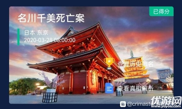 犯罪大师名川千美死亡案凶手是谁?《名川千美死亡案》是犯罪大师游戏中一个比较棘手的案件,大家一定都在为这个案子感到头疼吧。下面就是小编为大家带来的crimaster名川千美死亡案答案解析了,有需要的玩家拿走不谢!犯罪大师名川千美死亡案凶手是谁《名川千美死亡案》的凶手是宫崎。》》》crimaster犯罪