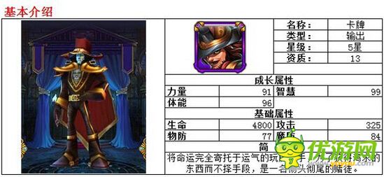 脸帝卡牌同样也是超神战队新英雄之一,超神战队脸帝卡牌怎么样?超神战队脸帝卡牌技能属性详解:基本信息——英雄类型:输出;英雄星级:5;英雄资质:13。成长属性——力量:91;智慧99;体能96。基础属性——生命:4800;攻击:325;物防:77;魔防:84。普通技能——万能牌:扔出卡牌,对沿途的敌人