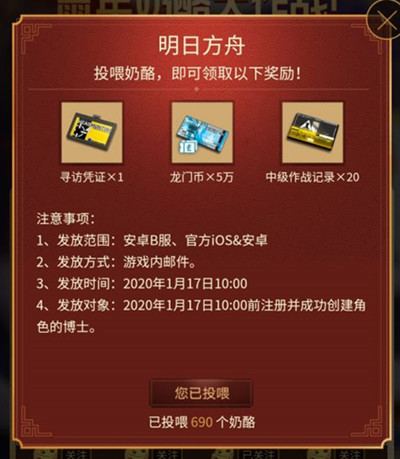 明日方舟拜年祭礼包怎么得?明日方舟拜年祭礼包奖励为寻访凭证*1、龙门币*5万、终极作战记录*20,这个奖励虽然不是特别多,但能够轻松白嫖还是很划算的。下面就是明日方舟B站拜年祭礼包领取方法了,一起来看看吧!明日方舟拜年祭礼包怎么得前往B站,找到【星游贺礼】活动入口,参与鼠年奶酪大作战活动,投喂奶酪即