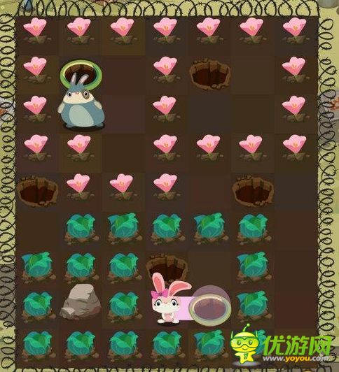 patchmania兔子复仇记穿过大火第2关攻略;patchmania兔子复仇记穿过大火第2关怎么过;第一步:粉色兔子走到绿色传送洞。第二步:粉色兔子吃光小花离开。第三步:胖兔子走进传送洞。第四步:胖兔子吃光卷心菜,过关。