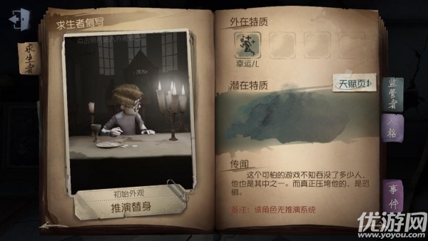 第五人格幸运儿怎么玩,具体的技巧和加点方法,相信有不少玩家都还不清楚。具体小编就给大家分享一下,第五人格幸运儿的玩法和加点推荐,有需要的小伙伴,和小编一起来看看吧。一,角色介绍幸运儿是游戏初期的第一个角色,其最大的特点就是没有特点。其特性幸运儿就是没有任何特殊能力,但是也没有任何负面影响。对于其他角