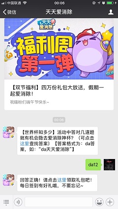 【世界杯知多少】活动中答对几道题就有机会隐去爱消除神杯,这是天天爱消除微信公众号2018年6月16每日一题问题,今天的天天爱消除答案可是游戏世界杯主题活动玩法,小编这就为大家分享下【世界杯知多少】活动中答对几道题就有机会隐去爱消除神杯的答案,希望对大家有帮助。2018天天爱消除6月16日一题问题【世