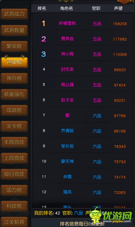 压轴的排行榜来了,每天看着自己的排名信息的上升是不是特别的满足,虽然离土豪和大佬们的差距还很大,但是起码上榜了不是,嘿嘿,小编的要求还是很容易满足的,三国里大大小小的排行信息是不是看的有点眼花缭乱呢!排行榜:武将战力、武将数量、主城繁荣度、声望、神兵、强化、成就、管卡、竞技等能清晰的看的自己每天的各