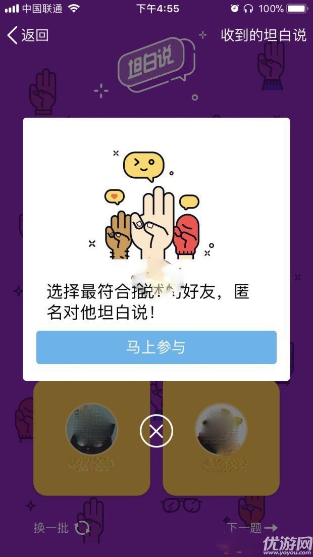 有些小伙伴更新了新版的QQ之后,不知道在哪里可以找到坦白说功能。这个时候,已经找到坦白说的用户,就可以通过邀请好友的方式,将他们邀请来一起玩哦!坦白说怎么邀请好友?1、打开坦白说后,做完十道题目,然后就会进入冷却状态;2、在等待页面,我们可以点击邀请好友,将消息转发给好友,分享后冷却时间就会刷新;3