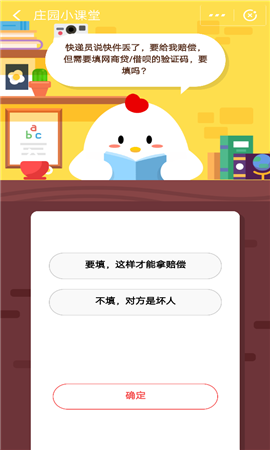 快递员说快件丢了,要给我赔偿,但需要填网商贷/借呗的验证码,要填吗?这是今日蚂蚁庄园的每日一题,答对的玩家可以获取大量的饲料来喂养小鸡,还可以增强用户对支付宝安全的了解。下面小编就来告诉大家答案。快递员说快件丢了,要给我赔偿,但需要填网商贷/借呗的验证码,要填吗?要填,这样才能拿赔偿不填,对方是坏人