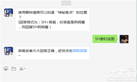 使用哪种道具可以知道“神秘鱼点”的位置?在侍魂胧月传说游戏中有很多道具,每种道具都有属于自己的用途,今天的玩法考验是神秘鱼点的位置。下面小编就来给公布下正确的答案。侍魂胧月传说2019年1月11日一题题目使用哪种道具可以知道“神秘鱼点”的位置?(回答格式为:SH+答案,如答案是莉姆酱,则回复SH莉姆