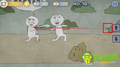 史上最贱暴走游戏第2-10关怎么通关;史上最贱暴走游戏第2-10关通关详细讲解;史上最贱暴走游戏第2-10关攻略;开始点击上上的按钮,再点后面隐藏在草丛里的剑拉到后方的人就OK了