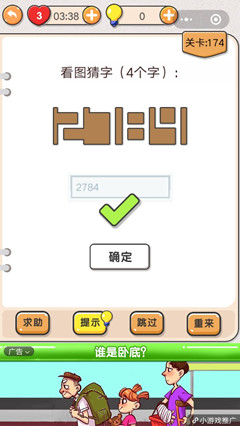 我不是猪头第174关答案是什么?我不是猪头关卡174的题目是:看图猜字(4个字)。相信很多玩家根本就看不懂题目下方的图片,更别说猜字了。下面就是我不是猪头第174关看图猜字攻略了,没有猜对的小伙伴们都来看看吧!我不是猪头第174关答案问题:看图猜字(4个字)答案:2784》》》我不是猪头攻略答案大全