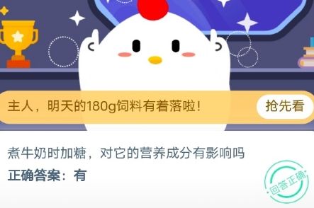 煮牛奶时加糖,对它的营养成分有影响吗?这是支付宝2020年10月16日更新的蚂蚁庄园题目。在秋冬季节很多人都会将牛奶加热后饮用,为了得到更好的口感还会在加热过程中放糖,那么这个做法是否会影响牛奶本身的营养成分呢?一起来看看吧!蚂蚁庄园10月16日每日一题答案问题:煮牛奶时加糖,对它的营养成分有影响吗