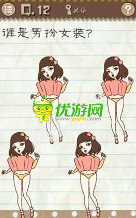 最囧游戏2第12关怎么过?;最囧游戏2第12关怎么通关;最囧游戏2第12关通关攻略;最囧游戏2第12关怎么过?【第12关通关攻略】最囧游戏2第12关的题目是这样的,【谁是男扮女装的?】而接下来就是四个长相一模一样,并且她们的poss也都是一模一样的,如果不采用其他什么奇葩招式的话那根本就分辨不出哪个