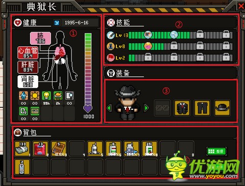 今天小编为大家带来上帝之城:监狱帝国典狱长状态详解:按c,弹出的典狱长状态栏。1:健康,健康最初游戏时全是问号,需要体检才能看到具体状况,后面有体检日期,体检后身体变化不会随动。2:技能,各种研发时会增加经验,每5级有额外的加成。3:装备,现在版本只有外观,没有属性,标准的纸娃娃。4:背包,典狱长身