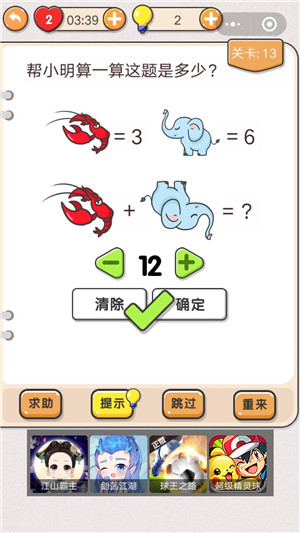 我不是猪头第13题怎么做?我不是猪头第13题的题目是:帮小明算一算这题是多少?这道龙虾加大象的题目难度真的不高,脑洞也不算太大,但大家还是需要多想想才能答对。下面就是我不是猪头第13题攻略了,一起来看看吧!我不是猪头第13题怎么做问题:帮小明算一算这题是多少?答案:12》》》我不是猪头攻略答案大全《