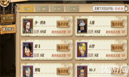 航海王燃烧意志强者挑战怎么玩?强者挑战是航海王燃烧意志游戏中一个限时游戏,玩家可通过挑战强者来获取对应强者碎片,达到一定数量就可以兑换该强者了。下面小编就来给大家介绍下玩法。航海王燃烧意志强者挑战玩法攻略第一步:每天分3个时间段刷新,分别是中午12点,晚上6点,晚上9点 第二步:刷新之后你点这个角