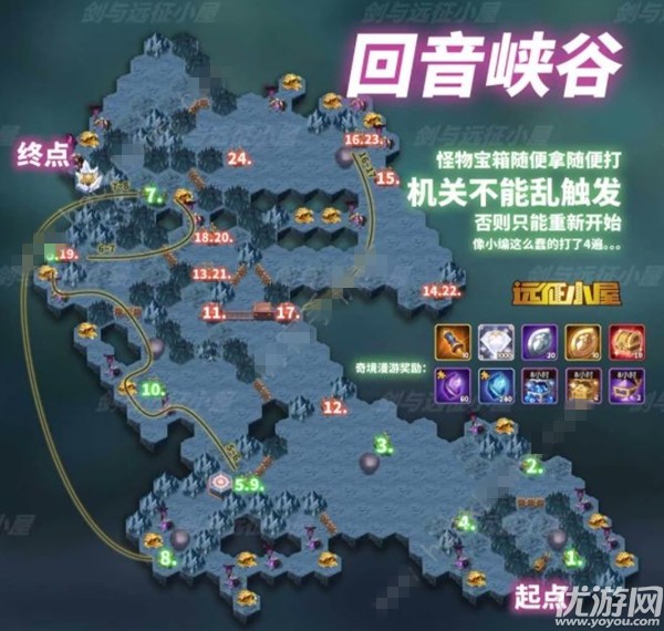 剑与远征主神试炼回音峡谷怎么过?1.66版本更新后,主神试炼副本加入了【回音峡谷】地图,这个地图的难度不高,怪物随便打,宝箱也可以随便拿,就是需要注意一下机关,这个是不能随意触发的哦!剑与远征主神试炼回音峡谷怎么过通关图:宝箱可以随便拿的,同时怪物也可随便打,关键是机关不要乱触发哦!开启条件:通关3