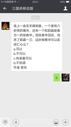 场上一血无手牌郭嘉,一个装有八卦阵的曹冲,还有一个和郭嘉距离为一的张春华。到张春华回合,他杀了郭嘉一刀,这时候曹冲可以发动仁心么,这是三国杀微信公众号2018年4月27日每日一题问题,今天的答案可是有点难度的哦,不知道有多少小伙伴知道答案呢,小编这就为大家分享下场上一血无手牌郭嘉,一个装有八卦阵的曹