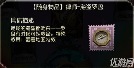 第五人格海盗罗盘怎么用,作为律师随身物品,相信不少玩家都非常关注着海盗罗盘的使用方法和作用,今天小编就为大家分享下第五人格海盗罗盘使用方法及作用解析,希望对大家有帮助。第五人格海盗罗盘使用方法及作用解析海盗罗盘介绍:迷途的海盗都明白——罗盘有时候可以救命。特殊效果:翻看地图特效。海盗系列皮肤和随身物