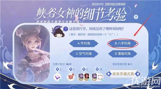 王者荣耀这张照片里公孙离是剪了哪种刘海呢?这是王者荣耀细节考验题目之一,题目给出的照片是公孙离的无限星赏官皮肤,想必很多玩家都不知道这款皮肤中公孙离的刘海叫什么,下面就让我们一起来看看正确答案吧!王者荣耀这张照片里公孙离是剪了哪种刘海呢问题:这张照片里公孙离是剪了哪种刘海呢?提示:看形状,我感觉应该