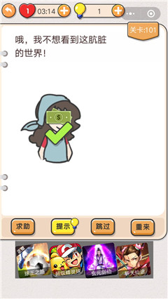 我不是猪头101答案是什么?我不是猪头第101题的题目是哦,我不想看到这肮脏的世界!看不见世界只有两个方法,一是闭上眼睛,二是世界消失,哪一个才是正确的操作方法呢?下面就是我不是猪头关卡101攻略了,一起来看看吧!我不是猪头101答案是什么问题:哦,我不想看到这肮脏的世界!答案:用钱遮住她的眼睛。》