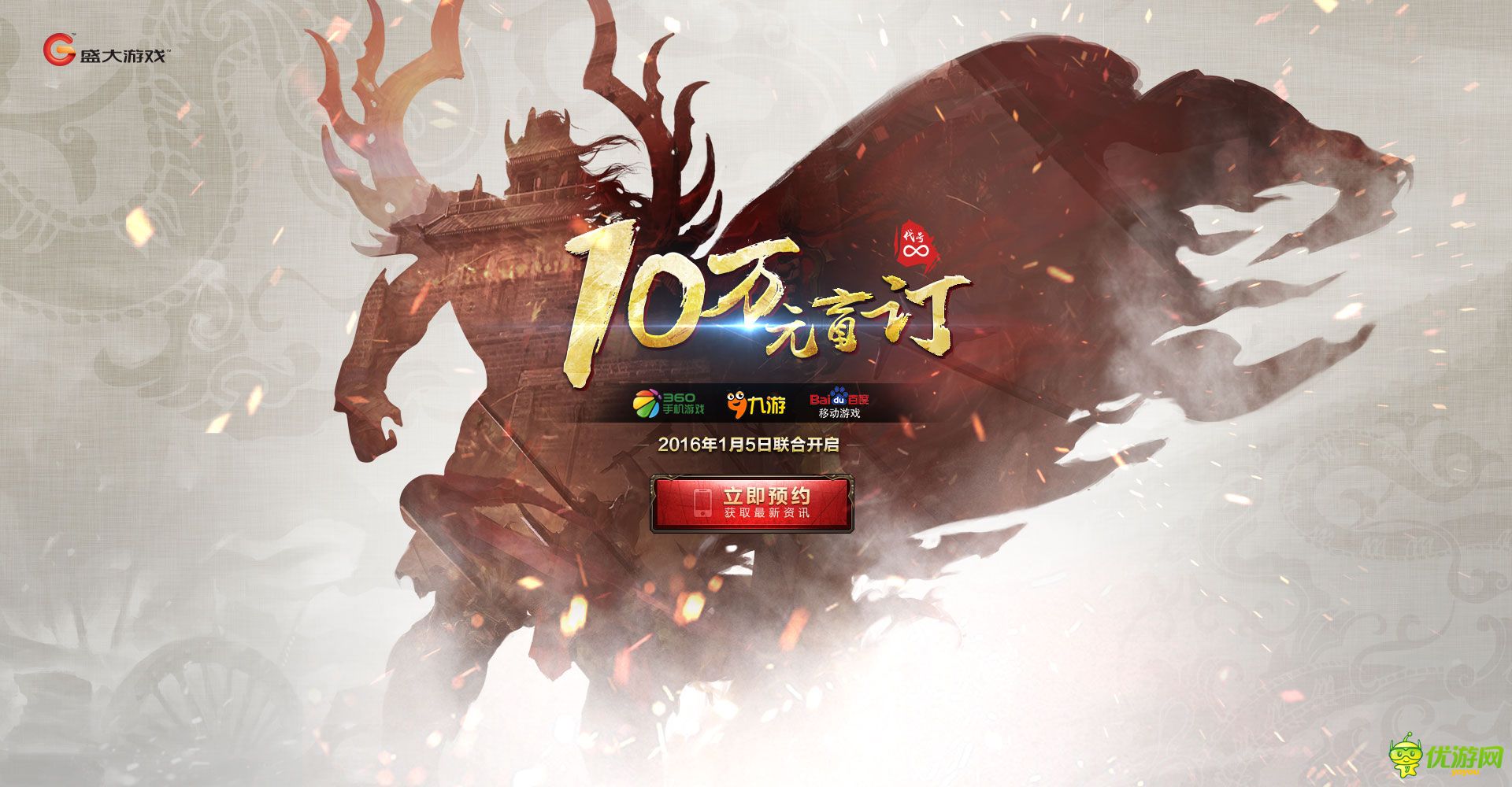今日(12月29日),盛大游戏对其神秘新作《代号∞》的悬念站world.sdo.com进行了更新,曝出将与360手机游戏、UC九游、百度移动游戏于2016年1月5日联合开启“10万元盲订”。本次《代号∞》悬念站更新,以一位勇士剪影为背景,硕大的“10万元盲订”十分引人注目。区别于一般盲订的适当定价和