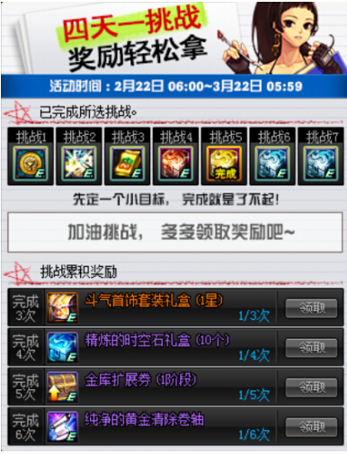 dnf四天一挑战活动奖励什么?四天一挑战活动怎么完成攻略,很多玩家都不知道dnf四天一挑战活动奖励什么?那么小编就带大家一起来看看吧。DFN四天一挑战活动介绍[page]活动时间2月22日(更新后)-3月22日(更新前)挑战内容与奖励