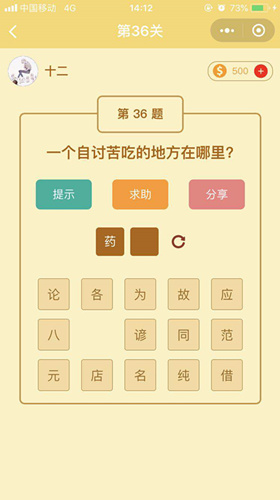 微信趣味脑筋急转弯第36关怎么过,一个自讨苦吃的地方在哪里,第36关卡的答案很容易就知道的,小编这就为大家分享下微信趣味脑筋急转弯第36关答案,希望大家喜欢。微信趣味脑筋急转弯第36关答案 一个自讨苦吃的地方在哪里药店