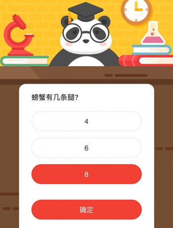 螃蟹有几条腿?4、6、8。这是森林驿站小课堂2020年10月20日的题目,现在正是吃螃蟹的最佳季节,吃货们在品味螃蟹的时候是否注意到它们有几条腿呢?下面就是这道题的正确答案了,小伙伴们一起来看看吧!森林驿站10月20日每日一题答案问题:螃蟹有几条腿?468答案:8知识拓展螃蟹属软甲纲,十足目,是甲壳