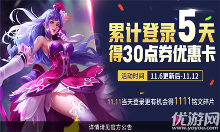 王者荣耀2018年双11活动有哪些?又迎来了一年一度的双十一活动,王者荣耀也为此上线了2个活动,在这2个活动中玩家能免费获得大量的奖励。下面一起和小编看看到底是一些什么样的活动。王者荣耀2018年双11活动介绍1、累计登录得30点券优惠卡活动时间:11月6日更新后~11月12日第1天:铭文碎片*10